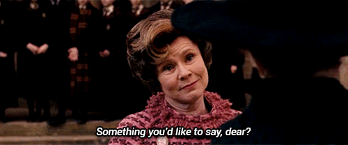 Brought to life in the movies by the great Imelda Staunton, Umbridge is as horrifying in the flesh as she is on the page. And she continues to be an important lesson: we should not allow people like her to attain positions of authority over others, nor be fooled by their false congeniality. When I went looking for a picture of Staunton-as-Umbridge, it turns out that just recently she commented on the parallels between her character and the Trump Administration, per Yahoo: