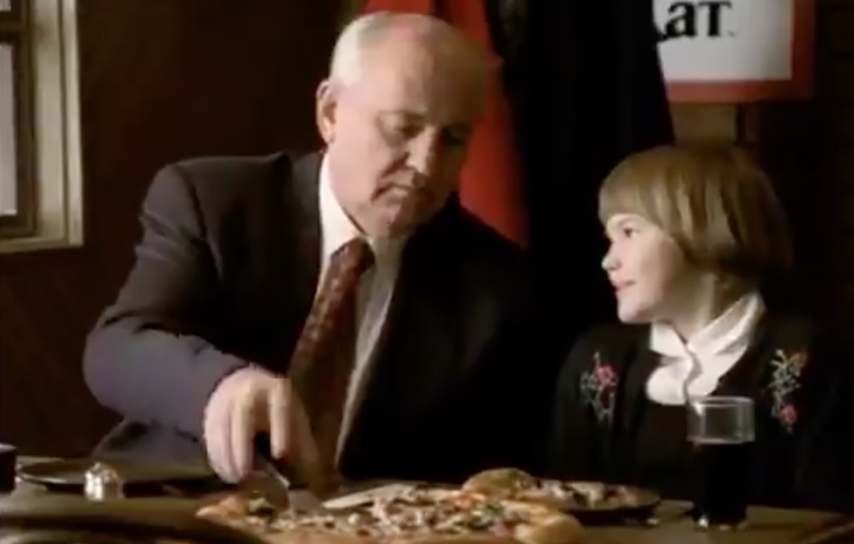 Gorbachev, the last Soviet leader of Russia, governed until 1991. A leader during the Cold War, he was the one that Ronald Reagan called on to tear down the Berlin Wall between West and East Berlin in Germany. So … the fact that this commercial portrays him favorably for the sake of subpar pizza is wild.