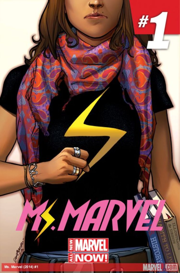 This is the cover to Ms. Marvel #1, an upcoming new series (with an old title) featuring the adventures of Muslim, shapeshifting teen Kamala Khan, Carol Danvers’ biggest fan. Under the direction of Kelly Sue DeConnick, We Love Fine is now selling the shirt Kamala is wearing in the cover of her first issue in men and women’s sizes, and a portion of the proceeds will be going to the Girls Leadership Institute!