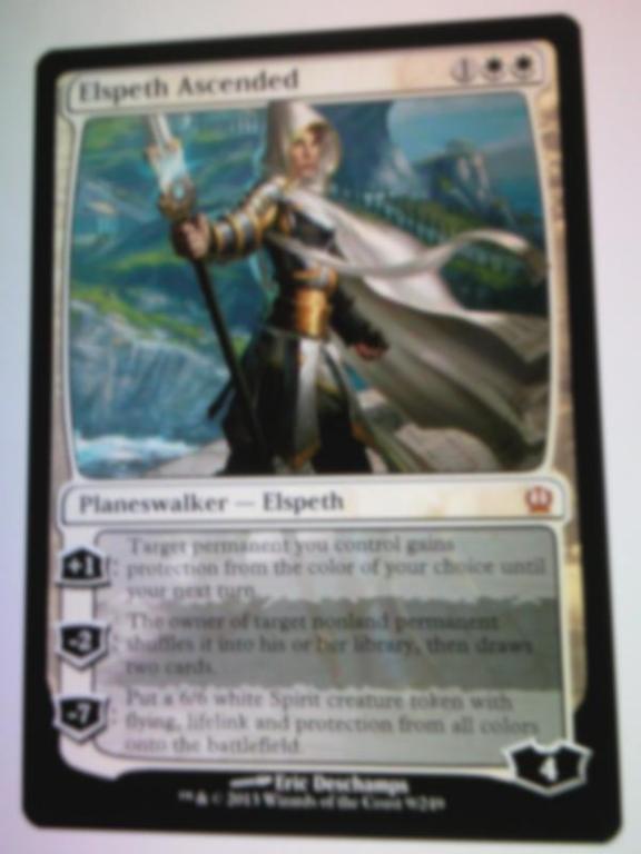 Elspeth’s +1 is a pseudo Mother of Runes granted protection ability. -2 is straight up Oblation. Her ultimate continues to bring on the pain in the form of a pseudo indestructable 6/6 lifelinker with evasion. Iridescent Angel on steroids.