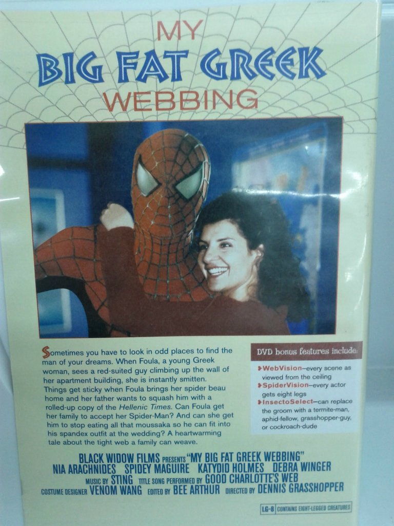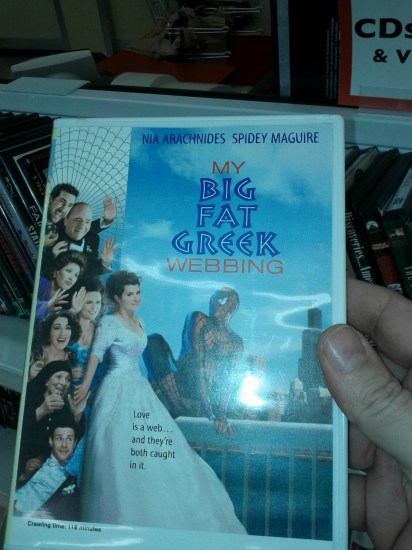 Hey guys, remember back in 2002, there was that movie that sat in theaters for what seemed like ever, and became the highest grossing romantic comedy of all time? You know, My Big Fat Greek Webbing, about a thirty-year-old Greek woman who is going through a midlife crisis and also Spider-Man’s there? While browsing a local resale shop, reddit user criscokkat came upon the above puntastic DVD. Wondering what in the world it could be, criscokkat posted a couple images to reddit, and another user pointed out that it was an old Nick Mag gag, wherein the magazine used to make fake DVD covers for people to slip into real DVD boxes.