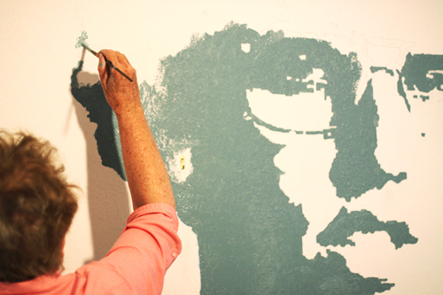 Blair writes that there’s “absolutely no art skill involved in this project,” but it clearly took a lot of creativity: In essence, she took a still from Napoleon Dynamite, grayscaled it and upped the contrast until it was black-and-white, and projected that image on the wall. From there, she and her mother filled it in.
