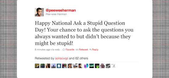 As Pee-Wee Herman helpfully reminds us, today is National Ask a Stupid Question Day. Thankfully, this isn’t a Hallmark holiday: Rather, the original idea behind Ask a Stupid Question Day is for students not to feel inhibited about asking ‘stupid’ questions in an educational setting — or, more broadly, in the world.
