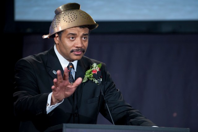 Noted astrophysicist, Director of the Hayden Planetarium, and host of Cosmos Neil deGrasse Tyson will be speaking during the Omaha Pastafarian conference “Apostacon” this September. Allow us to explain what that is and why we’ve photoshopped a colander on Tyson’s head.