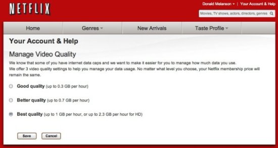 The new options offer three settings with different data rates: Good, at 0.3 gb per hour; Better, at 0.7 gb per hour; and Best, at 1gb per hour or high with HD. Since the Best setting is the only one which mentions HD, it can be assumed that HD content is only available on the Best setting. With the new settings, users who previously watched 30 hours of Netflix and rammed nearly 30gb through the intertubenet can lower their usage to a mere 9gb.