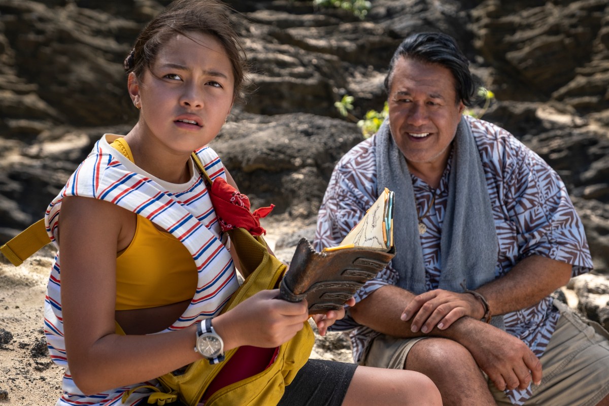 Finding ‘Ohana follows brother and sister Ioane (Alex Aiono) and Pili (Kea Peahu) along with their mother, Leilani (Kelly Hu) as they head from the home in New York where they’ve grown up back to O’ahu, Hawai’i after their grandfather, Kimo (Branscombe Richmond) suffers a heart attack. The kids don’t want to be in a run-down house with no wifi on an island they barely know, especially Pili, who misses geocaching and her friends at home. Not even meeting a new, rather odd local friend, Casper (Own Vaccaro) or Ioane’s instant crush on neighbor Hana (Lindsay Watson) make it worth it, until Pili finds a journal that might lead her to some hidden Spanish treasure that could pay of Kimo’s bills and get the family back to New York.