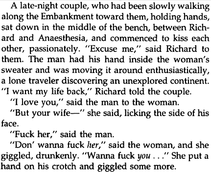 That’s it. The whole thing is only two paragraphs long, and as far as I can remember, that is as sexually explicit as the book gets. Heck, Romeo and Juliet gets more graphic than that once you parse out all the Elizabethan slang. Meanwhile in the rest of Neverwhere (spoiler alert!), the entire family of one of the main characters is depicted being brutally murdered maybe six or seven pages before the above scene, and later in the book (no seriously, SPOILER ALERT) another character gets literally honest-to-God crucified at the behest of an evil angel.