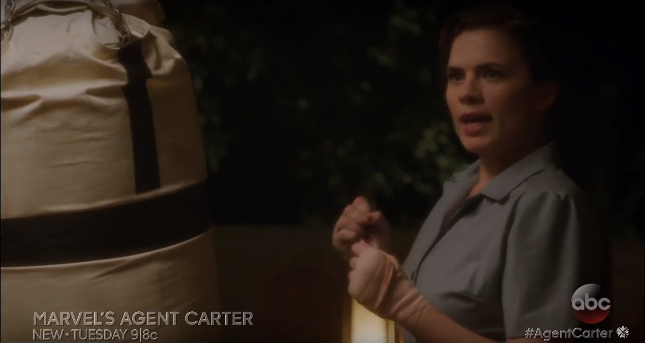 Anyway, before Peggy’s cathartic punching is unfortunately interrupted, I couldn’t help but notice a similarity to another scene involving a character from the same universe and a punching bag…