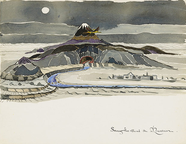 Hence, their upcoming book, The Art of the Hobbit, which includes a ton of Tolkien’s own illustrations that didn’t make it into the published Hobbit for one reason or another. The Guardian has six of those drawings up for the internet’s perusal, the majority of them being landscapes of The Lonely Mountain, lair of the dragon Smaug, drawn while the novel was in various stages of completion. Above is what is probably the earliest. More below: