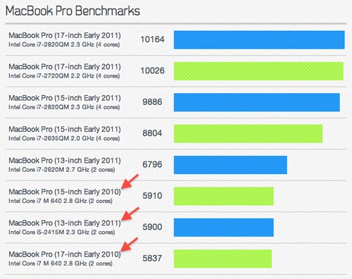 But lest we sweep them under the rug, those performance boosts are very real, thanks in large part to new Sandy Bridge quad-core processors from Intel. PrimateLabs looked through Geekbench benchmarking scores for the new MBPs (shown above), and had this to say: