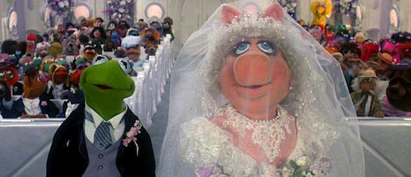 This wouldn’t be the first time Piggy’s ever done a wedding scene in a Muppet movie. The last time was in The Muppets Take Manhattan, the movie I’d call the black sheep of the Muppet Movie family if not for Muppets from Space. The MTM wedding was always sort of shrouded in several layers of questionable continuity. It takes place at the end of a broadway show that Kermit and the gang have been trying to put on for the whole movie, only Piggy surprises Kermit by hiring a real priest to officiate the in-show wedding instead of Gonzo. Fans have often wondered, and even bald-facedly asked if the scene was meant to depict the actual Kermit and Piggy getting married, and not the recently graduated college students (named Kermit and Piggy) who Kermit and Piggy were playing in Muppets Take Manhattan (characters who were, in the scene, playing characters in a Broadway musical). Kermit and Piggy have played coy about the legitimacy of the wedding scene since.