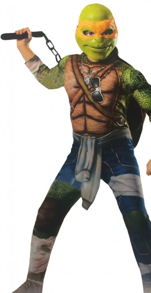 Then again, maybe the shell isn’t attached to Michelangelo’s body. Look at those straps across his chest. They seem to be a part of the fabric of the costume just as the pants are. Where are those coming from? Are they similar to the straps that Leonardo sometimes wears to hold his dual katanas, or does Michelangelo have to wear his shell like a goddamn backpack? Or are they just more douchey accessories? It’s clear he’s got no shortage of them, what with the sunglasses (that wouldn’t even fit his giant friggin’ turtle head you guys, come on), the dog tag necklace, and the four or five different taped up limbs.