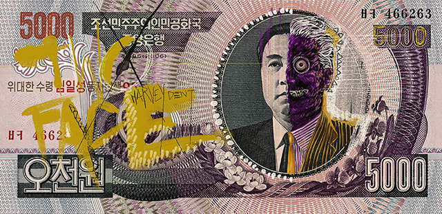 From Aslan Malik, the money-defacing artist who brought you dollar bills repainted as members of the Justice League, here’s the Injustice League on North Korean currency. Because villainy.