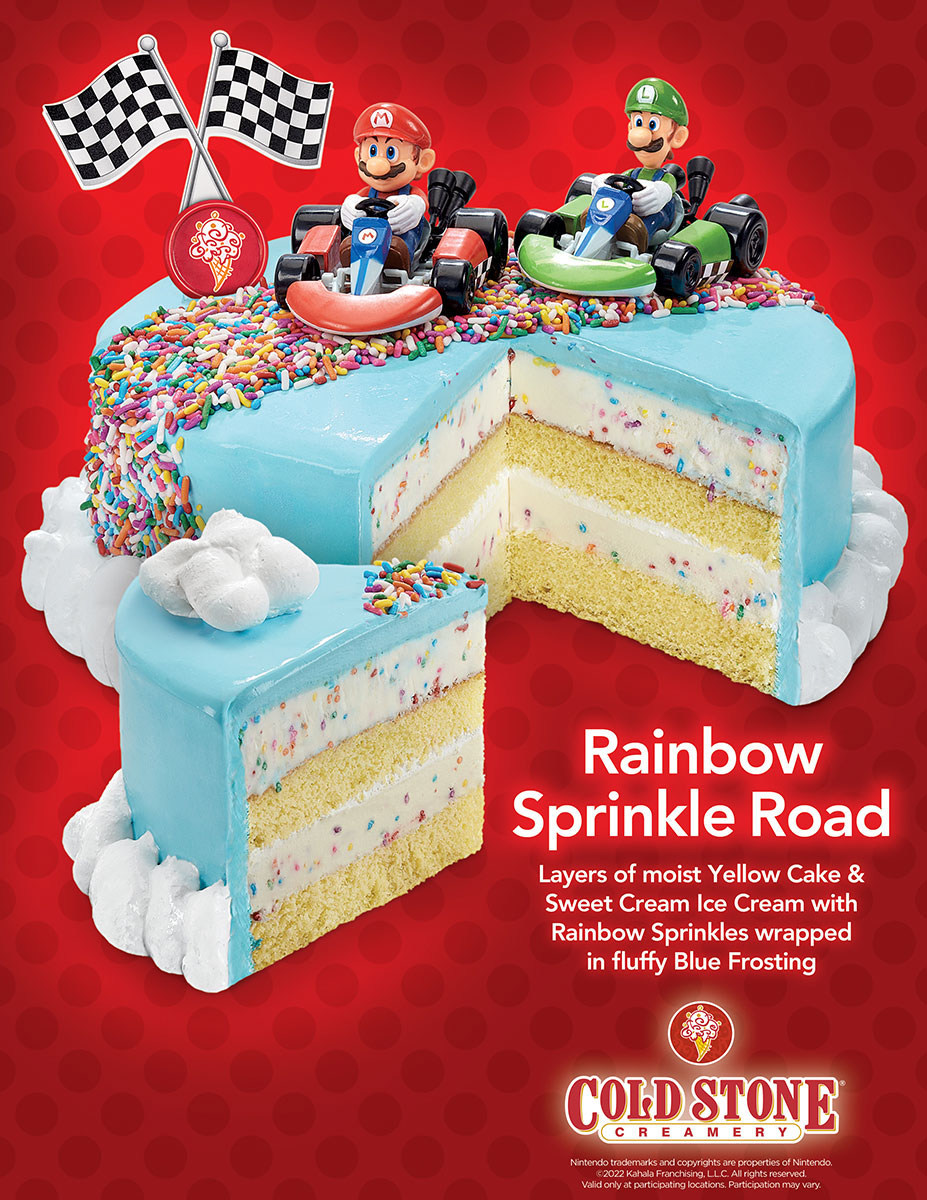 In the ongoing burst of limited summertime flavors of cold treats, Cold Stone Creamery has teamed up with Nintendo to offer three new ice cream creations and a cake that, hopefully, won’t ruin any friendships. “We are thrilled to announce that Cold Stone is joining together with Nintendo once again to celebrate ice cream season,” says Sara Schmillen, vice president of marketing for Kahala Brands, the parent company of Cold Stone Creamery.