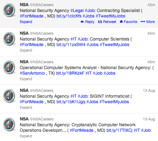 And with that “official” avenue closed, where might hopeful applicants turn but Twitter? Especially since the NSACareers Twitter account is just full of information, Some of it is even expressed in words that are in a dictionary. Just, y’know, not like a lot of it.