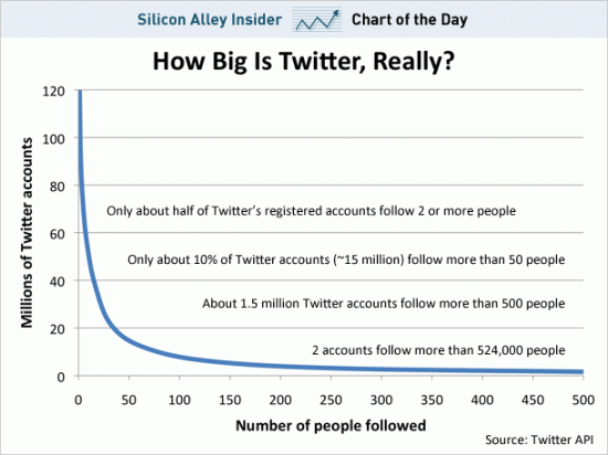 Using data that is currently only one month old, the source found that there are 119 million Twitter accounts following at least one account and there are 85 million accounts with at least one follower. With these numbers, Twitter’s 175 million figure, and a bit of math, one can see that there are 56 million accounts that aren’t following any other accounts and 90 million accounts without any followers. Using another “source” over at Facebook who said that a Facebook user doesn’t end up using the service unless they make ten or more friends, Business Insider attempts to put a definition on what constitutes an “active” account, and provides a few numbers: 56 million Twitter accounts follow at least eight other accounts, while only 38 million accounts are following 16, and only 12 million accounts following 64 accounts.