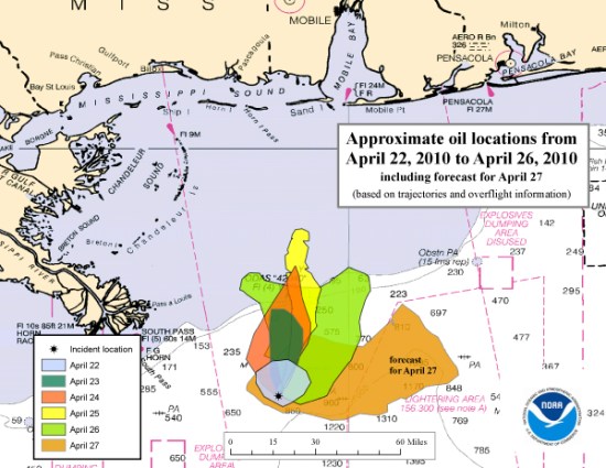 The coast guard reported the new estimate yesterday, starting up their plan for a controlled yet difficult burn of the oil. BP and its contractors, according to ABC, have tried unsuccessfully to seal the leaking wellhead with a dome or with the help of a submersible robot. Meanwhile, with fears of the oil reaching the shore in the next few days, Louisiana Governor Bobby Jindal has declared a state of emergency, and Homeland Security Secretary has called the spill an event of “national significance.”