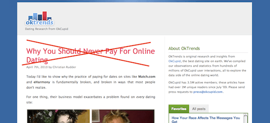 Screenshot: OKCupid: “Why You Should Never Pay for Online Dating,” April 7th, 2010.