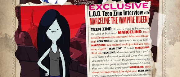 O: It’s kind of small. It’s very similar to my regular voice, so that aspect of it isn’t very hard. But getting her attitude down and stuff like that…I always find myself, that on the days that I go in to record Marceline, I’ll dress like her, in a weird way. People tell me that I dress like her anyway, sometimes, but especially on that day, I’ll throw on some rock n’ roll boots, maybe some red lipstick, and just go in there. I feel like that helps me get into character. Especially [helpful is] the fact that we all get to record it together. So I’m with John DiMaggio, and Tom Kenny, and Jeremy Shada, and we’re all playing off of each other. They’re such great voice actors, so I think that really helps, too.