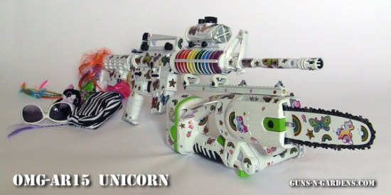 It seems like zombies have been trending forever, but guns with chainsaws mounted to them being pitched as zombie killing devices have picked up in popularity recently. That being the case, the guys over at Guns & Gardens wanted to get in on the fun too, but with a twist; their gun — the OMG AR-15 Unicorn — is marketed towards the little ladies in your life. Or anyone who digs rainbows, unicorns, and butterflies, really.