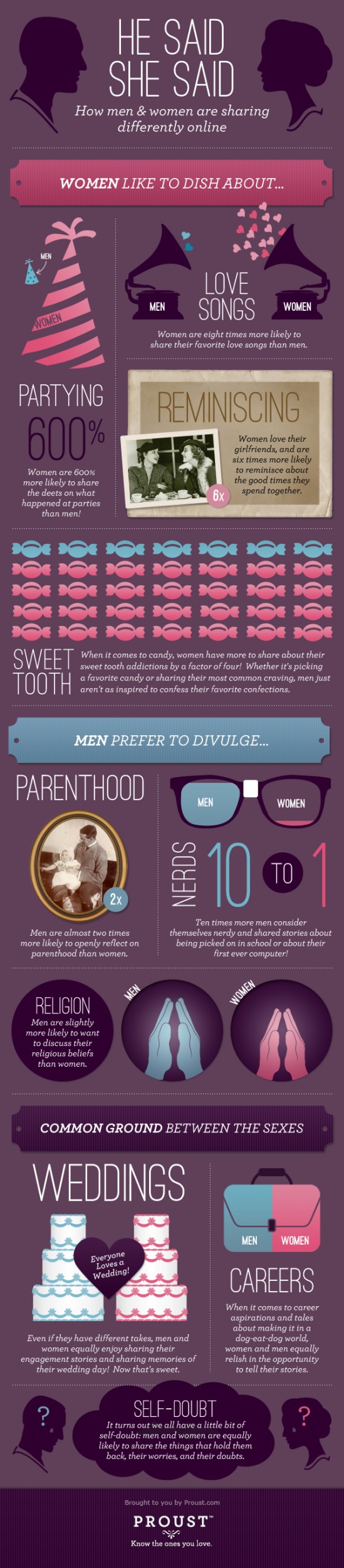 Ever wonder how men and women differ from each other regarding what they feel is worth showing everyone they know online? Proust, a social memory sharing platform, used data it has been collecting since July about what the two genders share online, and compiled said data into an infographic that holds somewhat surprising information because most of that information is so stereotypical. Women talk more about the parties they’ve attended and share love songs more than men, whereas men were more likely to divulge that they were “nerdy” and picked on in school. Where both genders find common ground, however, is discussing weddings and careers, as well as self-doubt.