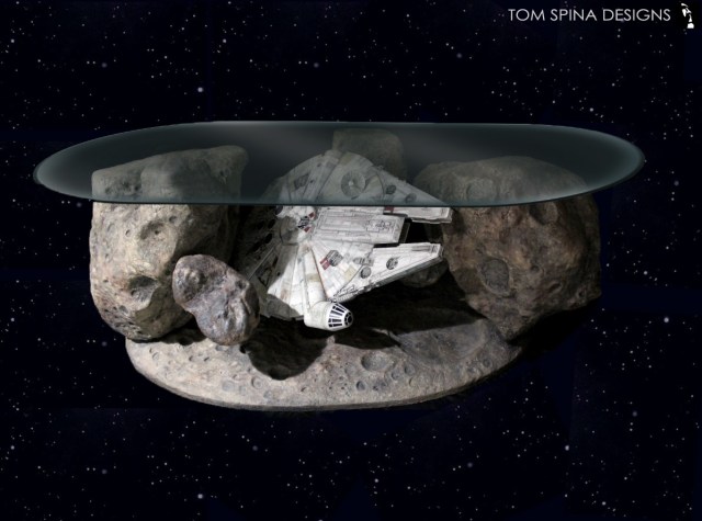Your toes will make .5 past lightspeed towards some ice when you stub them against the asteroid setting for this custom Millennium Falcon coffee table from Richard Riley of Tom Spina Designs. She’s one of a kind–the coffee table, not the Falcon, though she is too—and incredibly designed. Rather than place some glass over a scale model of the Falcon, which would have been so much simpler, they chose instead to recreate a dynamic scene in which the ship is bobbing and weaving through an asteroid field in Empire Strikes Back.