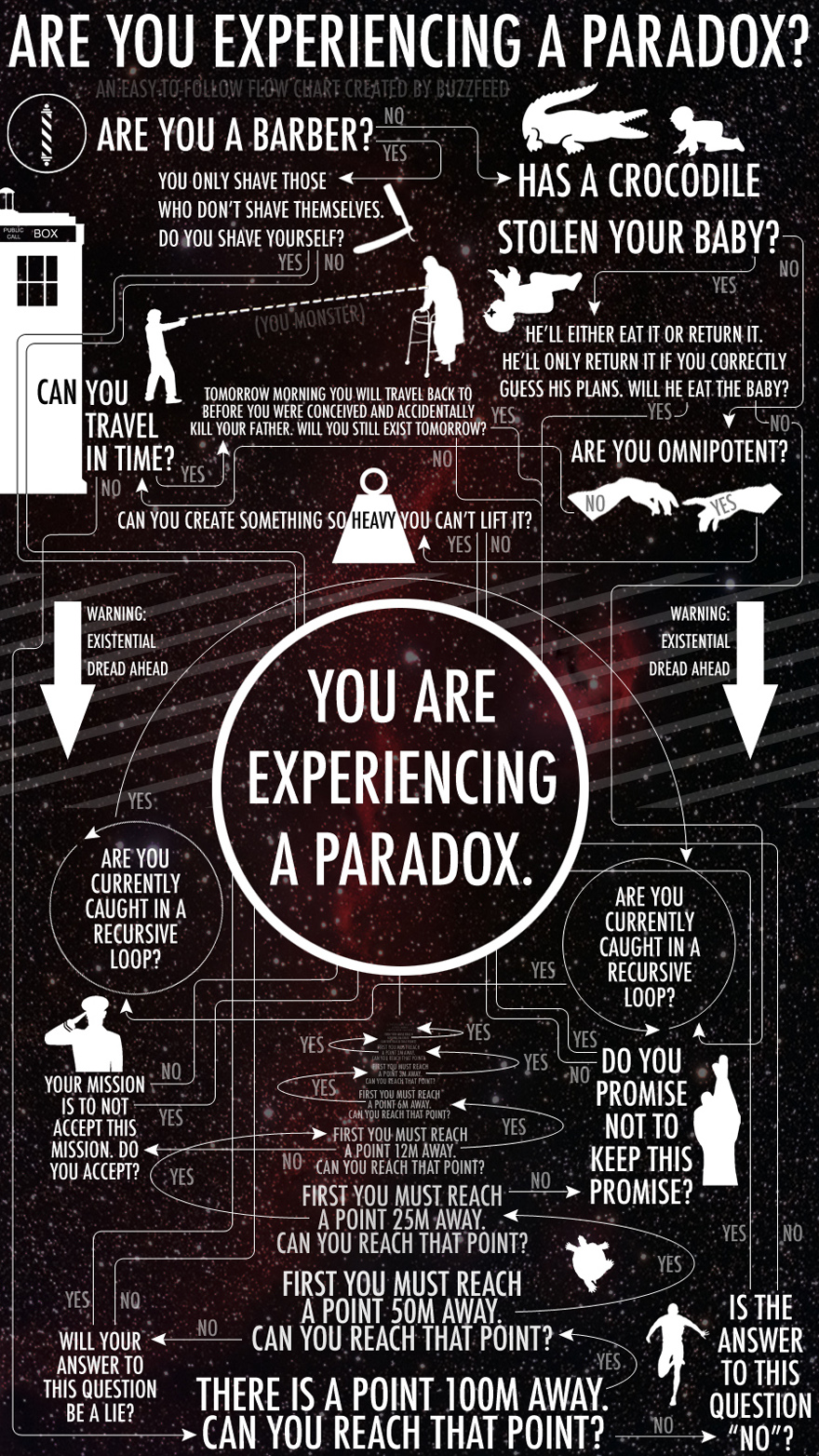 How many of us have woken up the morning after a hard night of traveling through time and killing/becoming our own grandparents and wondered, “is this a paradox??” Well, thanks to the fine folks at BuzzFeed, you can know for sure. Though if you’re capable of following the Yes/No loops, you’re probably some kind of Time Lord and wouldn’t need a mere infrographic to navigate the seas of time.