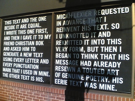 Poet Christian Bök and artist Micah Lexier collaborated to make this fun anagram that was posted on windows of the MKG127 art gallery in Toronto sometime during 2007.