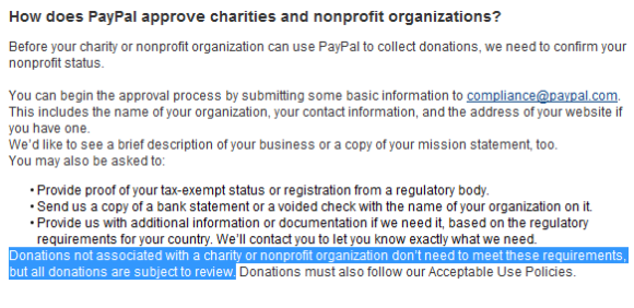 “Raise financial support for any cause,” it says. I’m not entirely sure if this was the pdf Winchell was referring to but it sounds similar. Paypal doesn’t even put the qualifying “worthy” on there. Regardless the Green Geeks blog pulled a few other choice sections of Paypal’s policy. Check out there site for several more but for instance: