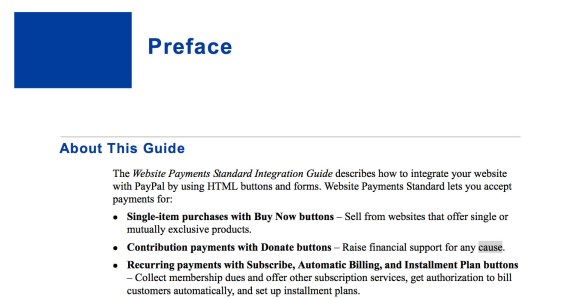 I did a little digging and Paypal’s Website Payment Standard Integration Guide (in pdf form here) is the only pdf I could find with mention of the Donate button and causes. Here’s a screenshot.