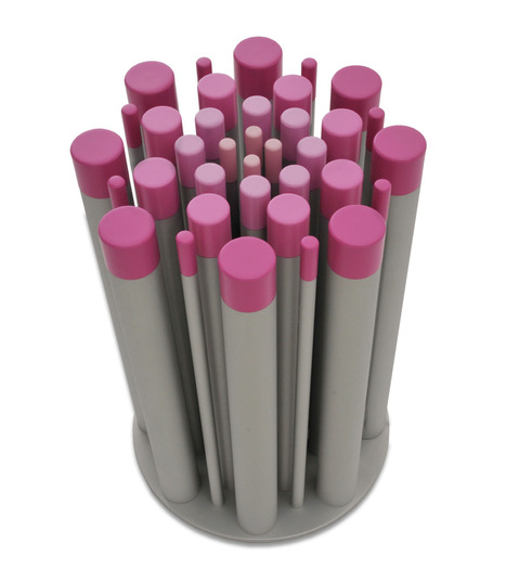 Designer Paolo Giordano has created a stool (seen above) and bench (seen below) modeled after the tops of a clutch of pencils. Probably for the extremely dedicated artist rather than someone who wants to come home and relax in a comfortable chair, the T 36 Stool and T 173 Bench are comprised of poles of varying widths topped with cylindrical objects in different shades of pink, modeled to look like the tops of pencils. Probably not the most comfortable stool and bench in the world, but what better way to display your pencilophilia?