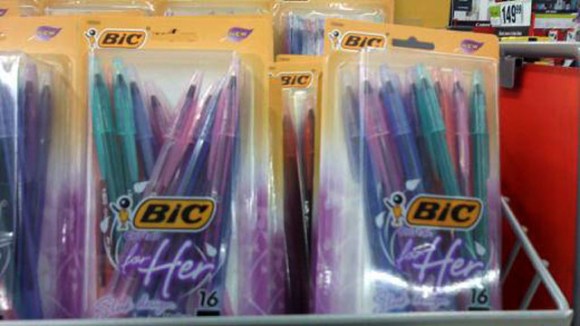Oh, goody goody gumdrops! Someone was thinking of girls when coming up with a new pen! A reader at Jezebel pointed out these new pens by famous pen-maker Bic, which are, as you can see, “For Her” and come in a variety of lovely pastel colors! I wonder if they will automatically dot my “i’s” with full circles or with hearts!
