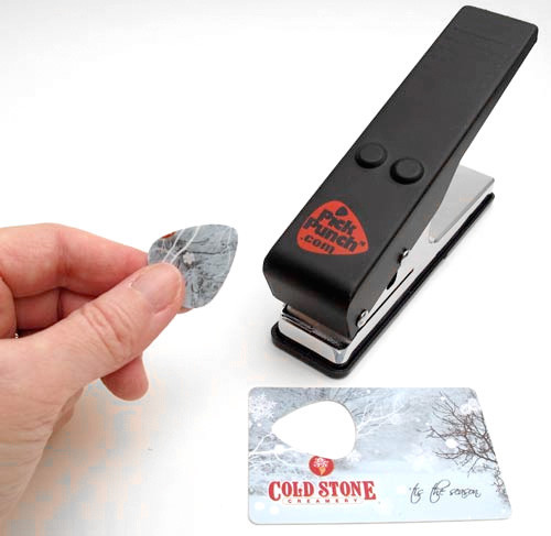 Today in “why didn’t anyone think of that before?”: The Pick Punch is a hole punch-like gadget that can be used to punch guitar picks out of expired gift cards and what have you. (Presumably you could use it on unexpired gift cards if you didn’t mess with the magnetic strip, but that’d just look weird.) A holiday gift to undermine fellow gift-givers who give out gift cards?