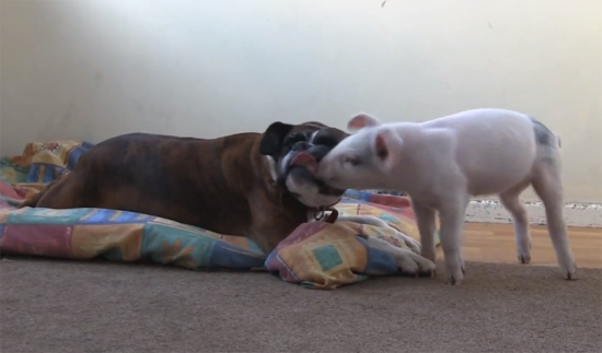 Susie, a boxer dog with a heart of gold, has had a rough life. Two years ago, she was rescued from a Welsh puppy farm where she was kept in terrible conditions. Now, she’s a healthy and happy resident of the Hillside Animal Sanctuary, where she met Tabitha, the pig. As you can see, the two are best buddies. You owe it to yourself to take a few minutes to watch this video of a pig and a dog playing together.
