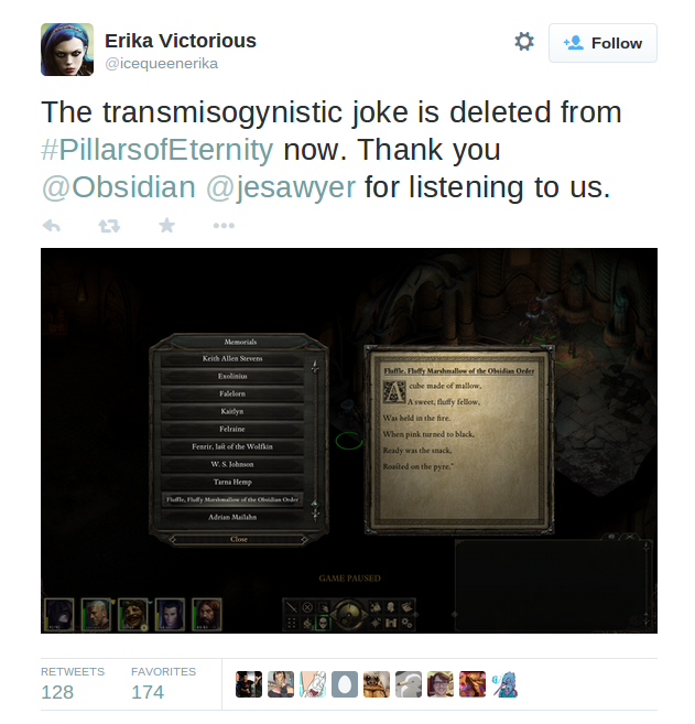 The transmisogynistic joke is deleted from #PillarsofEternity now. Thank you @Obsidian @jesawyer for listening to us. pic.twitter.com/MxSSbHalQ1