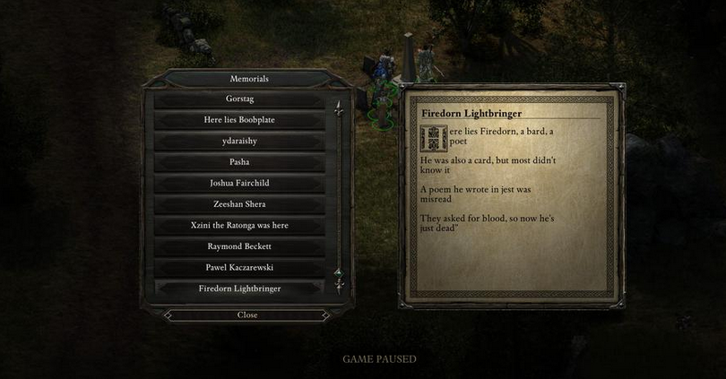 It’s come to our attention that a piece of backer-created content has made it into Pillars of Eternity that was not vetted. Once it was brought to our attention, it followed the same vetting process as all of our other content. Prior to release, we worked with many of our backers to iterate on content they asked to be put into the game that didn’t strike the right tone.