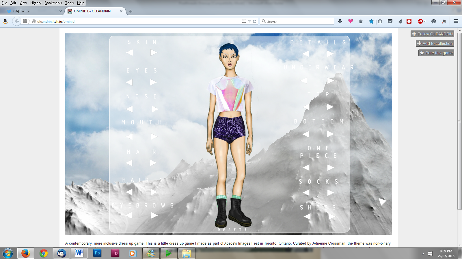OMINID is described as a “queer response to character creation games in culturally relevant video games”, and a response to how video game character creation systems tend to be very binary and gender essentialist. Dragon Age: Inquisition is probably the first major game to try to break this mold, by having all haircuts be the same for all genders, all genders can wear makeup, all can have Adam’s apples if you so choose. OMINID was created as a part of Xpace’s Images Fest in Toronto, where the theme was “binary in the non-binary world”. The gender of the character is intentionally ambiguous, and there are no rules as to what clothes are appropriate for them to wear. There are dresses, short shorts, button downs, and t-shirts. It’s a fairly pared down subversion of the dress-up game, and even though the game is technically unfinished, I think it does achieve what it sets out to do: make you think about the gender binary in terms of appearance.
