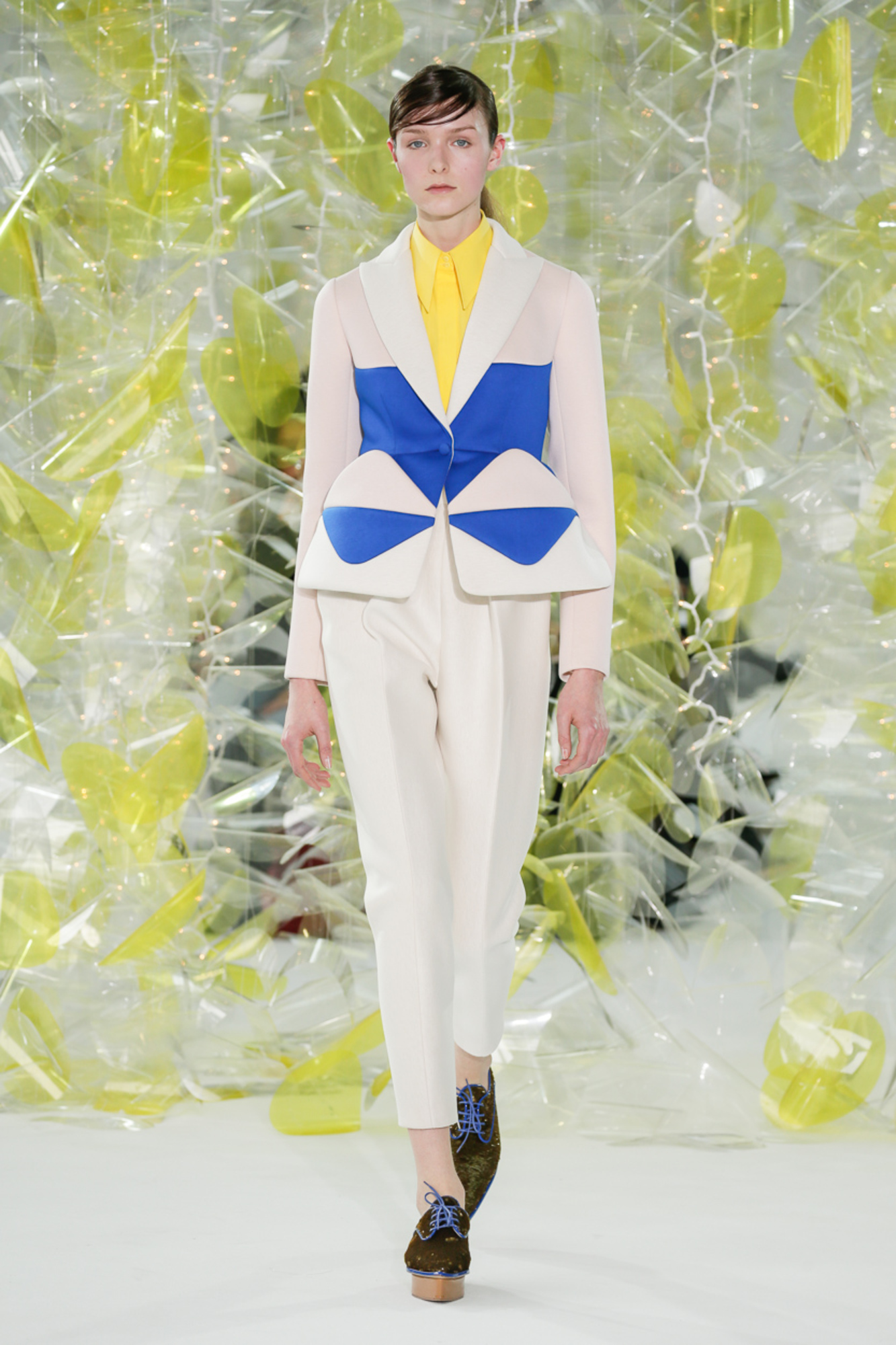 Even though a lot of designers interpret fall and winter as the time for a darker color palette, many designers this season opted for lighter colors for their collections, particularly in New York. Delpozo’s light and vibrant palette pairs perfectly with their super scruptural pieces, like this amazing suit that looks like it’s almost in the shape of a bow. I would love to see something like this in a game like Mass Effect. If the Illusive Man had been a woman, I feel like he would be all over this look.