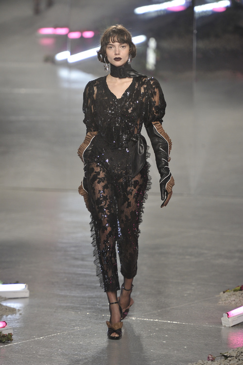 Rodarte can be pretty hit or miss for me, but I actually really like (most of) their latest collection. I understand that the entire point of Rodarte is to be Too Much, but I often find their Too Much crosses the line into messy. Still, I think with this one they struck just the right balance. I actually really love the tights embellished with ruffled leather. Like, I would wear them. According to Vogue, it’s inspired by the flower children heyday of Berkeley, as well as art nouveau, and ’60s folk singers and The Godfaher, so make of that what you will; I definitely see some of it. The standouts in this collection are definitely the jumpsuits, which are black and ostentatious and fabulous. If they ever make a Bayonetta 3, I would LOVE to see Bayo in this jumpsuit, because she would SLAY.