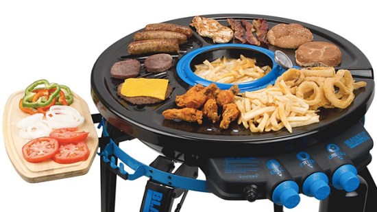 The Blacktop 360 is a portable grill, similar to the various outdoor cooking instruments one sees on informercials at 4:30 in the morning that make an entire family dinner, but poolside. It includes your standard infomercial style array of equipment packed into one unit, such as an IR grill, a griddle, and a warming plate. The Blacktop 360 goes one further, however, and includes a deep fryer right in the middle, so now one can make French fries in peanut oil while getting back to nature and connecting with the great outdoors.