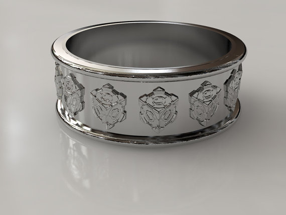 We’ve featured rings inspired by Portal before, but these are probably appropriate for a more special occasion. Created by Etsy seller 17thbit, they are 8 mm wide and come in sterling silver. One version reads “You Have the Portal to My Heart,” the other features the companion cube. So obviously, they don’t have to be wedding rings, but they sure could be. If that’s your thing, you lovey-dovey gamers, you. More views of the rings after the jump.