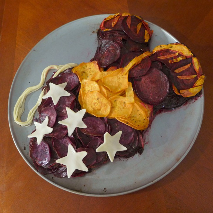 Potatoes Anna is a French dish of sliced, layered potatoes cooked in melted butter that’s been a staple in fine French dining since Napoleon III first took the throne. In order to get the signature bustier colors down on her Potatoes Diana (get it? Genius!), Oseland uses beets, sweet potatoes, and purple sweet potatoes (those are a thing?) in an easy-to-arrange pattern. The stars are made from mozzarella cheese, and the lasso of justice is a few strands of cooked spaghetti.