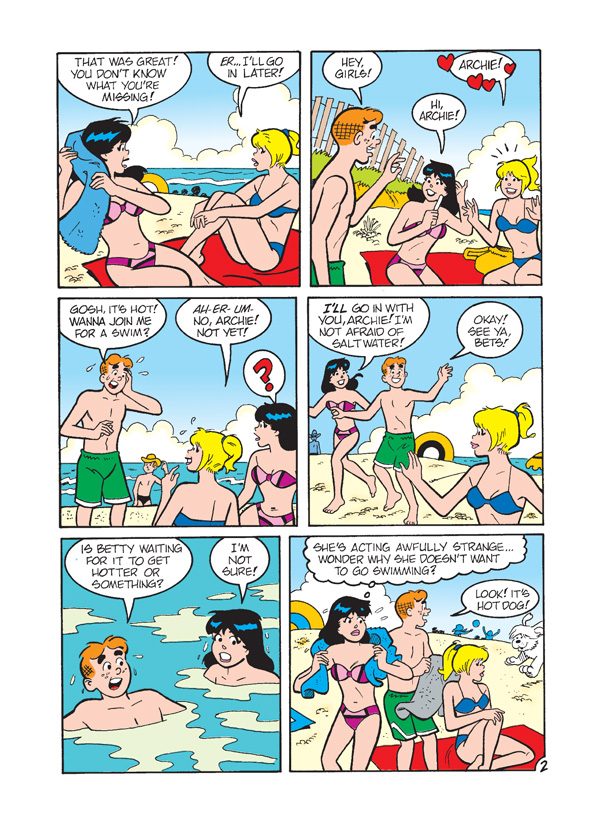 Betty and Veronica are meeting for another great day at the Riverdale beach … but Betty is curiously reluctant to get in the water … What does she know that no one else does? Find out in “Marked Woman,” the beachy-keen lead story in this fun-in-the-sun Jumbo Comics Digest!