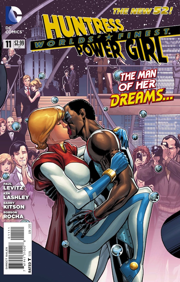 This month is “WTF” month at DC Comics, which they assure us stands for “What The Fifty-two.” What this means, tangibly, is that each New 52 issue out in April will feature a cover that’s… well, based on what I’ve seen, no more sensationalist than your average sensationalist comics cover. The promise this time, however, is that the stuff on these covers is actually representative of what’s inside, and that each cover is part of a double spread, with the other half of the image revealing an even more sinister twist to the story. Here’s a preview of Worlds’ Finest #11, the book of dimensional refugees, renegade-superheros, and best buds Power Girl and the Huntress.
