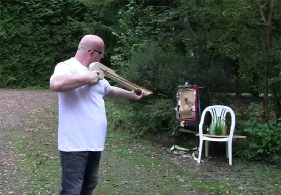 Using a slide similar to that found on a shotgun, the slingshot can be quickly cocked and fired. The slingshot is especially impressive because it uses a magazine of ball bearings, loading each shot as the weapon is cocked. Though not the most powerful of Sprave’s creations, he says it is almost certainly one of the fastest. Read on below to see a video of the slingshot in action, and enjoy the new “action packed” intro sequence.