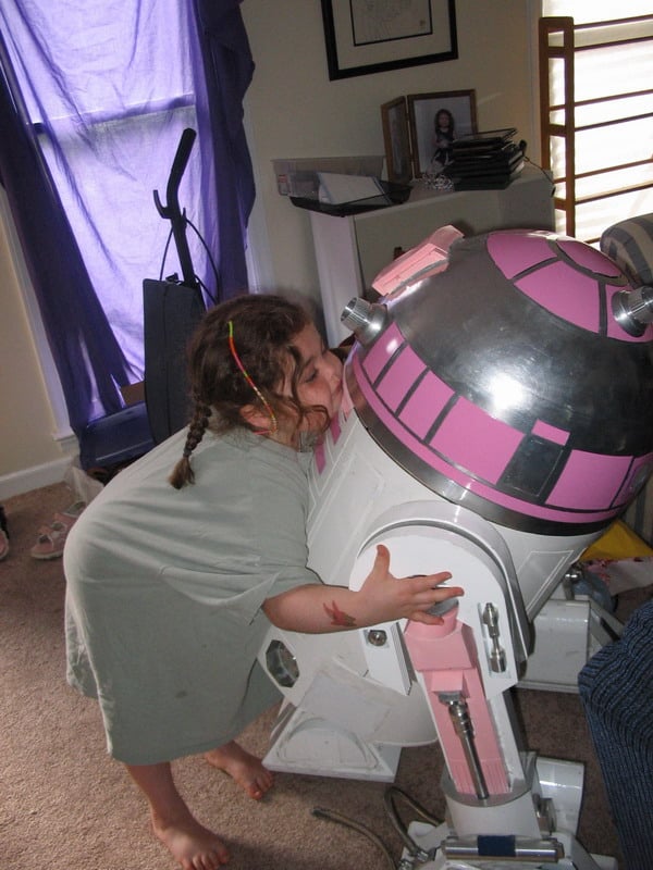 So, the elder Johnson, who happens to be the founder of the 501st Legion, the world’s biggest official organization for Stormtrooper cosplayers that does charity work around the globe, got in touch with the R2 Builders Club to see about building Katie her very own droid. Albin and his older daughter, Allie, aimed to make it pink and name it after Katie (hence R2-KT).