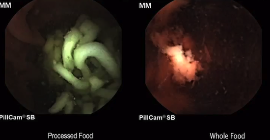 In Bardin’s experiment, she fed two subjects similar but fundamentally different meals. The first subject received gatorade, instant ramen, and gummi bears; the second subject ate handmade noodles, hibiscus tea, and pomegranate-cherry juice gummies. The digestion of these meals was recorded with the pill cams, demonstrating quite viscerally how differently the human body handles these foods.