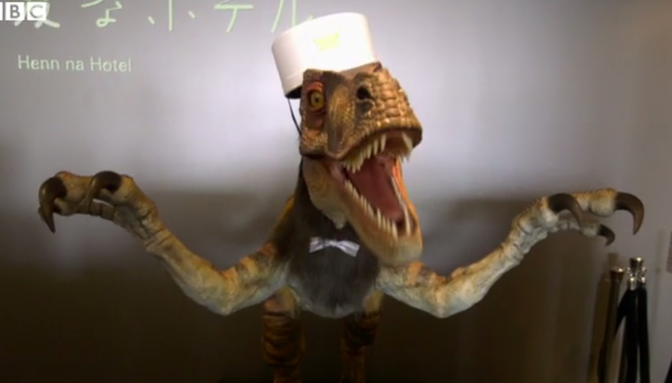 As evidence for this new conclusion, I present Japan’s Henn-na Hotel (literally “strange hotel”), in which robots run the entire business from top to bottom—raptor robots, apparently. Raptor robots that wear hotel employee hats and bowties and brusquely tell you how to check in with little patience for your slow primate brain to understand their take on the English language.