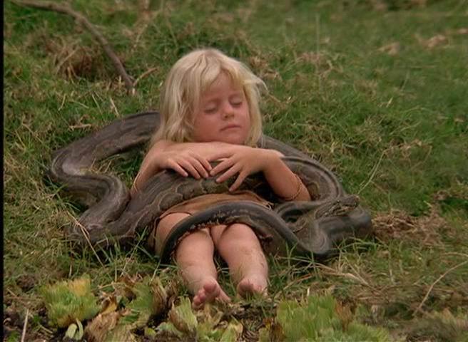 So, in case this movie has flown under your radar, be warned, this will contain spoilers because there are elements I really, really need to discuss. Our heroine Sheena, as every single one of these movies requires, is an orphan who survived a cave collapse that killed her parents. The two-year-old seemed to survive by running away before entering the cave, but we’re told it’s actually a miracle because she was “the chosen.” She definitely develops powers under the guidance of her adopted mother who teaches her to communicate with animals. Now, when there is a scene like this (CHILD WITH A SNAKE) that is played completely straight, that was when I knew this is going to be a fun watch.