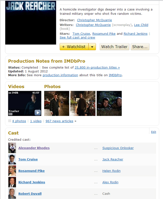 As of right now, he’s sitting comfortably between Anna Kendrick and Damian Lewis. In his most recent gig, he’s billed as Suspicious Onlooker in Jack Reacher, which stars Tom Cruise. Rhodes’ sudden traffic spike has actually pushed him above Cruise so that Rhodes now tops the list of actors for the movie. Check it: